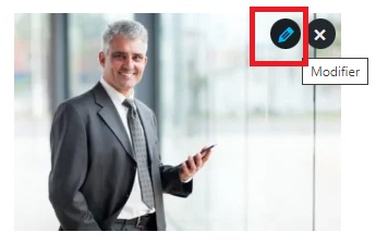 Pour chaque élu, vous allez pouvoir ajouter une photo, son nom, son poste et sa mission. Pour modifier le contenu, cliquez dans les encarts et modifiez le texte. Pour modifier la photo, cliquez sur le crayon en haut à droite de la photo :