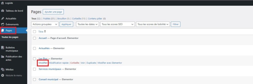 Rendez-vous dans la section « Pages » de votre back-office. Ensuite, glissez votre souris sur « Les élus » puis cliquer sur « Modifier » (Attention, cette page ne se modifie pas avec elementor !).