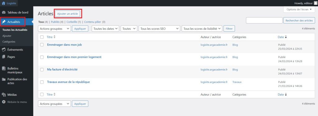 Une fenêtre va s’ouvrir sur votre droite où vous allez apercevoir l’ensemble de vos actualités. Vous devez ensuite cliquer sur « Ajouter un article ».