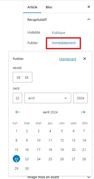 La section « Récapitulatif » est très utile dans le cas où vous souhaitez programmer une actualité. En effet, vous pouvez cliquer sur « Immédiatement », à côté de « Publier » pour choisir la date et l’heure à laquelle vous souhaitez que votre actualité soit publiée.
