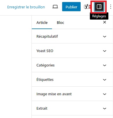 La dernière fonctionnalité que vous devez connaitre est celle qui vous permet d’ouvrir la boite à outils pour rédiger et mettre en forme votre actualité. Lorsque vous cliquerez dessus, une barre latérale avec de nombreuses options de réglage s’ouvrira à droite de votre écran :