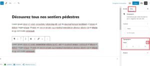 Pour modifier la taille du texte, vous devez sélectionner votre texte puis dans la fenêtre à droite de votre écran (bien vérifier que vous êtes sur « bloc » et non « article ») dans la rubrique « typographie » vous pourrez changer la taille de votre texte. Afin de choisir la taille, vous pouvez cliquer sur le curseur entouré en rouge dans l’image ci-dessous.