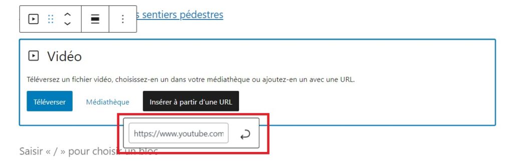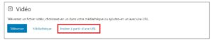 Ensuite une fenêtre va s’ouvrir, vous devez cliquer sur « Insérer à partir d’une URL ». En effet, il est déconseillé d’intégrer directement des vidéos sur le site depuis votre médiathèque. Les vidéos sont très lourdes et risquent de ralentir les performances du site. C’est pourquoi nous vous invitons à les héberger sur Youtube.