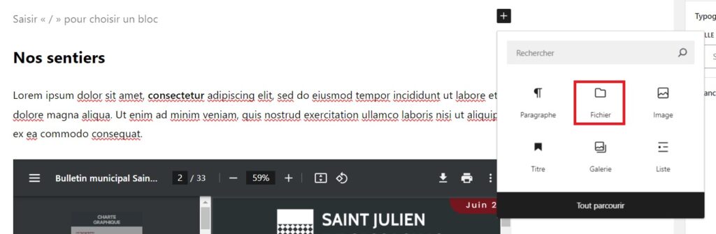 Pour obtenir cette affichage. Vous devez créer un nouveau bloc et utiliser le widget « Fichier » :