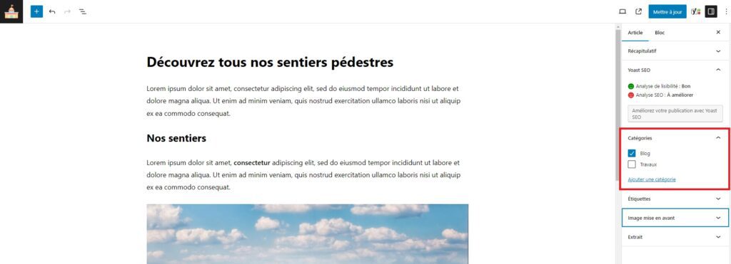 Pour ce faire, vous trouverez une rubrique dédiée aux « Catégories » à droite de votre écran, dans l’onglet « Article » :