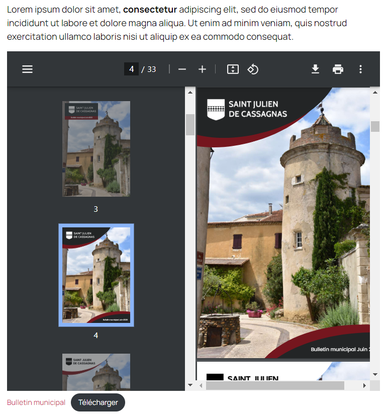 Une seconde option vous permet d’intégrer le PDF directement dans votre actualité comme dans l’exemple ci-dessous :