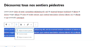 Pour centrer, aligner sur la droite ou sur la gauche le contenu, vous devez sélectionner votre texte puis de cliquer sur l’icône dédié à cet effet comme dans l’exemple ci-dessous :